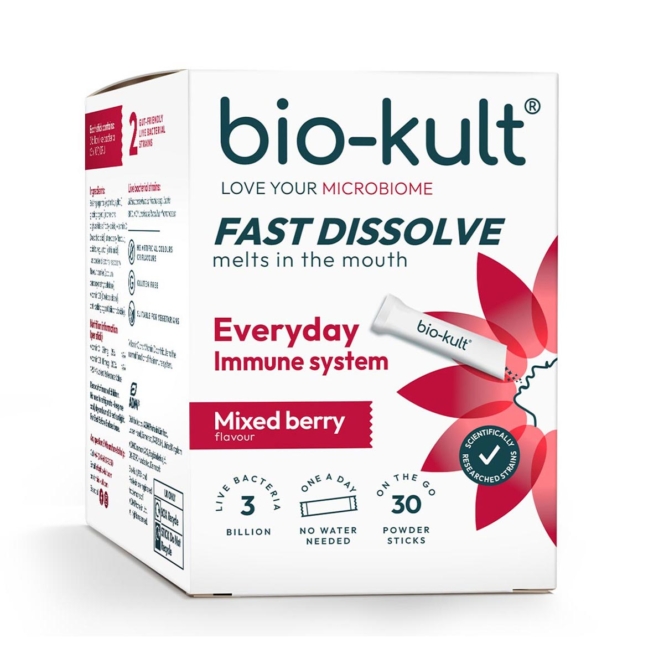 Bio-Kult Fast Dissolve Immune je dodatak prehrani sa živim kulturama mikroorganizama, vitaminom C i vitaminom D.